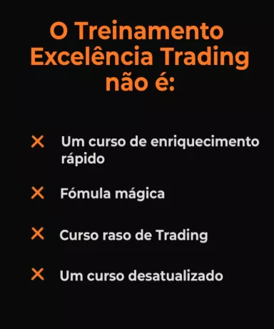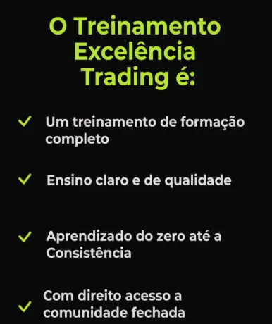 O Treinamento Excelência Trading é um Programa de Formação completo com Mentorias sobre as melhores técnicas de mercado, como SMC, Wyckoff, Elliott e Preço/Volume. Além do aprofundamento na Análise técnica e todo o trabalho de transformação mental e comportamental/psicológica que o trader de alto rendimento precisa fazer. Fazemos todo o processo de desenvolvimento de atitudes que são ganhadoras no mercado, desenvolvimento de autoconfiança e autocontrole, tudo voltado diretamente para o Trading!